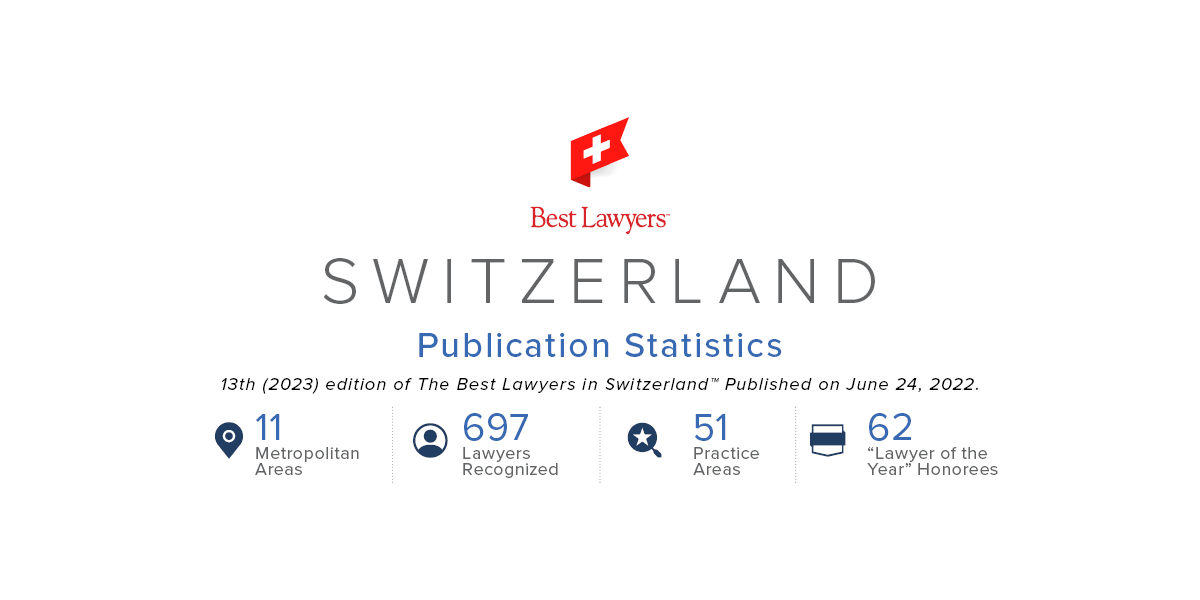 It is our honor to announce the 2023 edition of The Best Lawyers in Switzerland™. For the 13th Edition, Best Lawyers honored 697 lawyers in 51 practice areas.